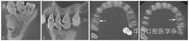 A、B:CBCT矢状位示36、37牙近中根及24、25牙根折裂;C、D:轴位见15、25牙根折裂(箭头示)。