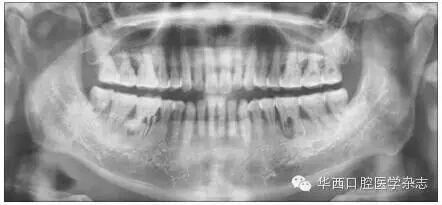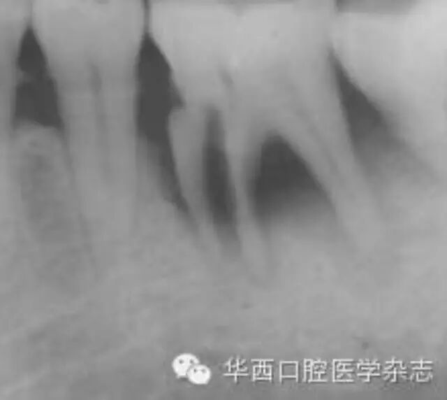 36牙近中根见根管下段扩大、伴牙周膜间隙增宽以及根尖周骨质吸收;46牙近中根折裂,折片移位。