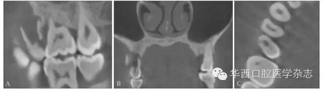 A、B:CBCT矢状位、冠状位见15牙根折裂,冠状位见根管壁较对侧同名牙变薄,折片向颊侧移位,C:轴位见15牙颊侧根管内径扩大,提示有内吸收。