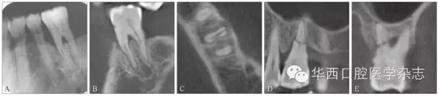 A:根尖片示36牙近中根根管细线样增宽;B、C:CBCT矢状位、轴位示近中根折裂;D、E:CBCT矢状位、冠状位示同一患者26牙腭根横行折裂。
