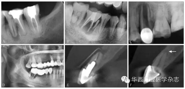 A、B:36、46牙根管治疗后折裂;C、D:25牙冠修复、47烤瓷桥修复后牙根折裂;E:11牙桩冠修复后折裂,根尖孔扩大,根尖周骨质吸收;F:21同名牙正常牙根,注意二者根尖孔形态的差异(箭头示)。