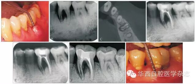 A:初诊口内见牙龈肿胀溢脓,牙周深袋;B、C:根尖片及CBCT轴位见36近中根折裂;D:生物活性材料注射充填后暂封;E:垫底+树脂充填修复后;F:6月后复诊根尖片见根周骨质密度增高,提示有骨质修复;G:复诊时口内示牙龈肿胀溢脓消失。