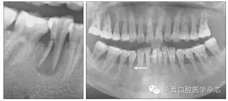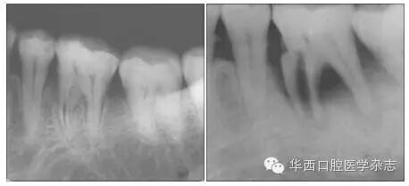 左:36牙近中根管下段内径增宽;右:36牙折线明显,折片向近中移位,伴牙槽骨吸收。