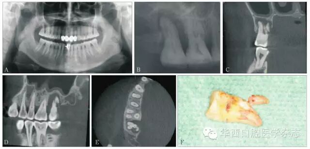 A:曲面体层片示17根周骨质吸收;B:根尖片示17远中牙槽嵴见致密条状影;C、D、E:CBCT冠状位、矢状位、轴位图像示17腭根折裂,折片向远中移位;F:17拔除后见17腭根折裂。