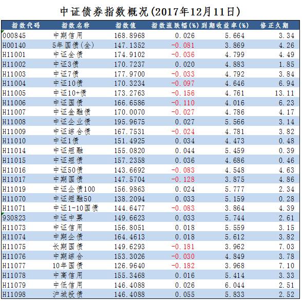 当日中证债券指数涨跌互现。中证全债指数下跌0.036%,到期收益率4.799%,修正久期4.49。当日涨幅居前的三条指数是沪城投债指数、中证短融指数和中证短债指数,分别上涨0.055%、0.044%和0.036%。