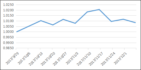 当下非标理财产品收益率较高,年化收益率超过7%,性价比突出,在组合中50%资产配置该类产品(鹏华固收系列产品)。权益类资产结构机会较大,下半年市场活跃,阿尔法及贝塔机会都存在,将30%资产配置中证500指数增强FOF,其余20%资产投向黄金ETF、现金类资产。本组合开始于2017年9月29日,截止2017年10月20日,组合单位净值为1.0084。