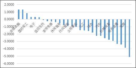 从行业板块来看,上周非银、食品饮料、军工等表现较好,钢铁、采掘等周期板块及计算机、传媒等成长板块下跌。