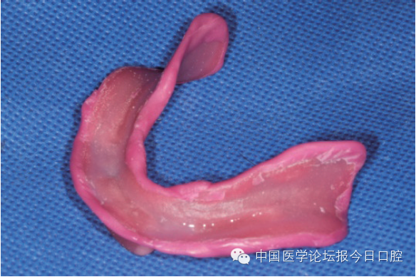 在行边缘整塑过程中,切忌过度的肌功能运动,如让患者舌体伸出左右摆动、医师过度牵拉上唇左右摆动等。这些过度的肌功能修整会造成全口义齿边缘过短,影响其固位。如图4所示。