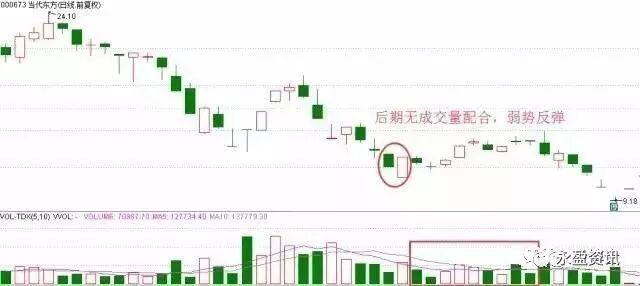 2.当代东方(000673),短期内超50%的大幅下跌后,在2015年8月3日、4日出现了“曙光初现”的标准见底信号,符合该形态的图形要点,但是后期成交量未能有效放大,该股仅仅弱势反弹后,继续向下跌。