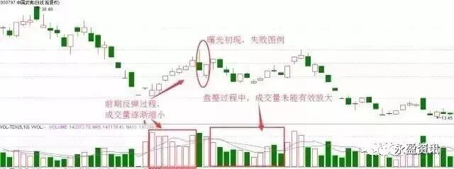 3.中国武夷(000797),在2015年7月25日、28日出现了“曙光初现”的K线组合,但前期从低位开始反弹起,成交量一直处于逐渐缩小的状态,这在一定程度上说明了反弹力度有限。而7月25日的阴线放量并带长影线,说明上方抛压较重,28日阳线成交量明显小于阴线的成交量,且之后成交量一直萎缩,该股盘整一段时间后,继续下跌。
