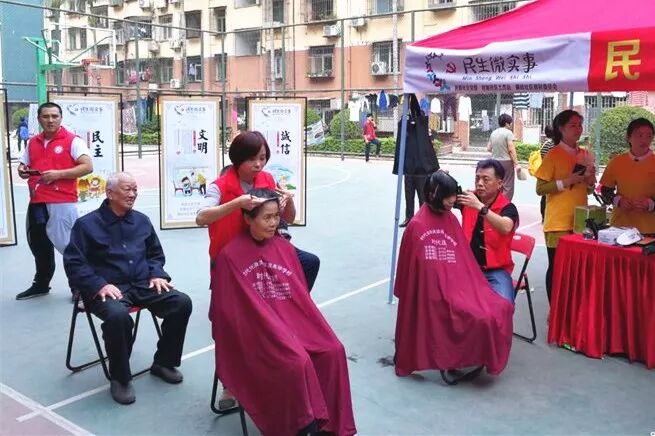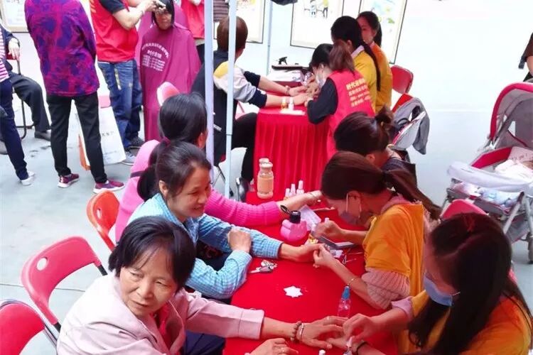 民新社区妇联、民新社区义工、辖区医疗机构和美发美甲沙龙为大家带来了日常用品(蟑螂药、蚊虫药、计生用品等)、健康知识宣传、保健、安全知识、公益美甲、免费理发、小儿推拿按摩、血压测量、智能数字化体检等多项公益活动。