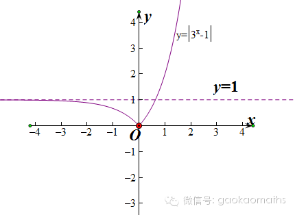 接下来画出函数y=|3^x-1|的草图.同学们都学过图象的绝对值变换规律,只需把上面这个函数的图象在x轴上方的部分保留,在x轴下方的部分沿x轴翻折上去即可.