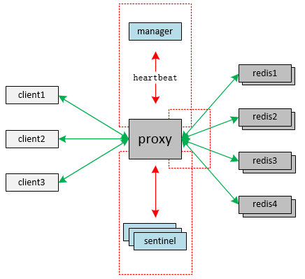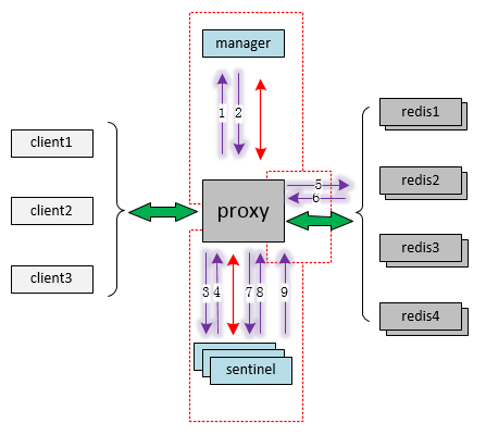 在上图的基础上,我们增加了与 manager 交互的模块、增加了与 sentinel(redis-sentinel)交互的模块,修改了 redis 连接管理模块,图中三个红色虚线框所示: