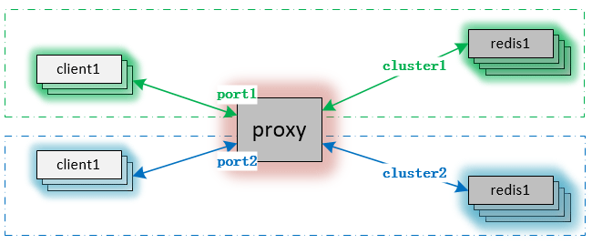 twemproxy 支持一个 proxy 实例同时代理多个分布式集群(server pools),每个集群使用不同的网络端口实现数据流的隔离,下图中 port1 应用于 cluster1 代理,port2 应用于 cluster2 代理: