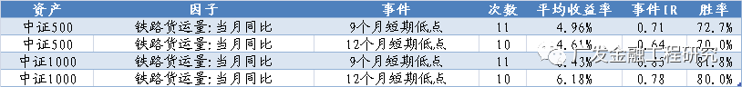 2. 宏观因子事件,我们监测到【铁路货运量同比】处在过去9/12个月均值减两倍标准差以下的低点位置,该事件触发后,历史11次500指数与1000指数分别上涨4.9%,6.43%,而同期沪深300指数将跑输500指数接近2%,从这一结果看,未来一个月中盘中证500与偏小盘的中证1000指数大概率有绝对收益,而沪深300指数将相对跑输。