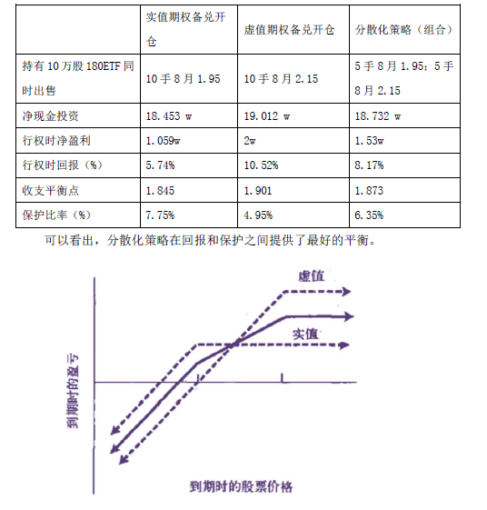 一般来说ETF 备兑开仓的主要目的是在拥有ETF 的同时增加收入。但开仓的时刻需决定选择什么样的认购期权,ETF 的波动率越大,提供的回报就越高,但所涉及的风险也更大,因为它价格有迅速下跌的可能性。所以不仅要考虑到投资回报,还需要考虑对价格下行的保护。虽然所有的备兑认购期权策略都涉及就拥有的ETF 出售看涨期权,但是不同执行价的认购期权选择涉及到不同的备兑策略类型。一个是虚值ETF 认购期权,另一个是实值ETF 认购期权。一般来说,虚值认购期权备兑开仓策略能够提供较高的潜在回报,但它们的风险保护程度较低,相比而言,虚值认购期权备兑开仓策略风格更为激进。而实值认购期权是更为防守型的策略。是否有一种备兑开仓的策略能尽可能多的将高潜在回报和充分的下行保护结合在一起,不仅能提供较高的行权时回报,也能提供较多的下行保护。有一种办法就是分散化,就其拥有的ETF 标的一半头寸出售虚值看涨期权,再将另一半出售实值看涨期权。通过一起出售这两种期权,就可能得到所寻求回报和保护的分散化。当然,实值期权与虚值期权的的出售比例可根据各个投资者对潜在回报和下行保护的需求进行调整。