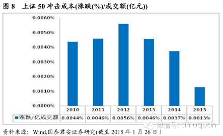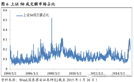 从图 6 可以看出上证 50 的成交额占全市场成交额的 10%以上,因此,其整体的流动性还是非常不错的。