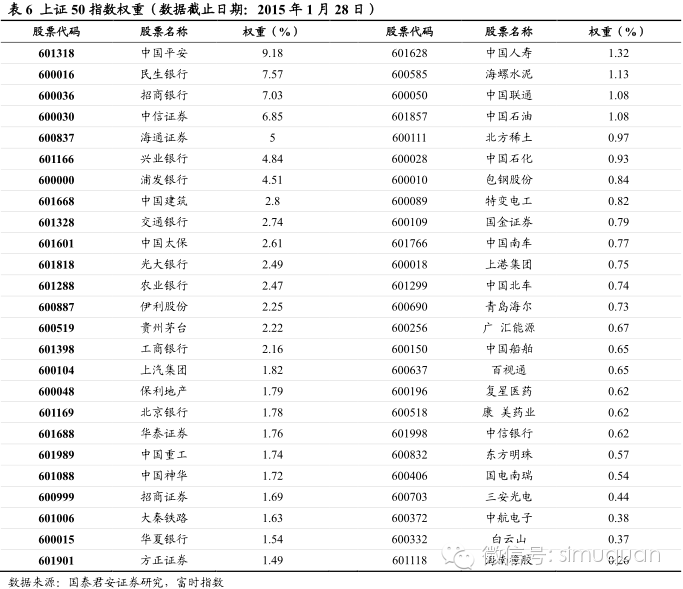 上证 50 指数与富时 A50 指数在指数构成上较为相似,50 只成分股中,重合的个股有 30 只,这 30 只重合的个股共占上证 50 指数的权重为84.32%,而占富时中国 A50 指数的权重为 78.13%。下面对比了 2015 年1 月 28 日两个指数的配置情况。