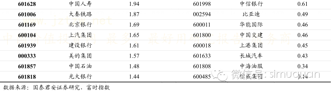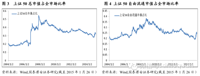 基于上证 50 成份股超大市值的特征,我们进一步测算了上证 50 全市场市值占比。从图中可以看出,在 2007、2008 年最高峰时期上证 50 成份股的总市值约占全市场总市值的 60%,近些年的占比也基本上维持在30%左右。而从自由流通市值考虑,上证 50 成分股占总市场的 20%以上。