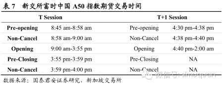 新交所富时中国 A50 指数期货以富时中国 A50 指数为标的资产,合约月份包括两个近月合约,以及 3、6、9、12 月份合约。到期日为合约到期月份的倒数第 2 个交易日,在交易时间上分为日盘和夜盘。