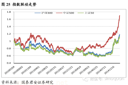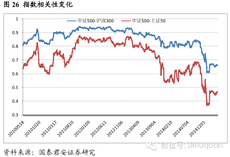 作为一个新的期货品种,与其他标的走势的联动性越低则其可替代性越弱。从图 25 我们可以看出,上证 50 和沪深 300 由于成份股重叠,走势呈高度相关。而相比之下,中证 500 在 2013 年以来走出了自己独立的行情。为了进一步探究相关性变化,我们用滚动 90 交易日的时间窗口来计算不同指数相关系数的变化。在图 26 中可以清晰看到,中证 500和沪深 300 的相关度在 2014 年以来大幅降低,这与 2014 年以来价值和成长风格大分化行情相吻合。因此,未来中证 500 期货极有可能和成长类股票趋同度上升。而基于中国 A 股市场小盘股长期跑赢大盘股的特点,随着中证 500 股指期货的推出,市场格局会发生一定变化,小盘股从某种角度上有了有效的做空工具。
