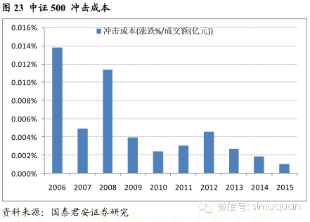 作为一个合格的股指期货标的,抗操纵性是不可或缺的考核要素之一。首先在图 21 中我们可以看到,中证在2010 年以来在全市场成交中占比稳定,维持在 24%左右。相比之下,沪深 300在 2013 年创业板牛市行情中,全市场成交额占比略有下降,而 2015 年前后由于大盘股行情,成交额占比又迅速上升。可以看出,中证 500 基于其较为均匀的风格分布,成交额占比波动较小。从换手率角度看,从图 8 中我们也可以看出,中证 500 成份股换手率差异较大,不集中于某一个流动性水平区间。此外,根据Amihid(2002) 的冲击成本指标作为抗操纵性的另一个代理变量,图 22 展示了历年中证 500 的冲击成本的大小。我们可以明显的看出,中证 500 的冲击成本正处于上行的趋势,目前处于 0.001%/亿元的水平。这也反映出,随着近半年以来股市赚钱效应增加,成交量急速扩大,指数冲击成本变得很高。换句话说,在市场资金量较小的时候,操纵市场相对来说更容易。整体来说,中证 500 的抗操纵能力还是比较优秀的。