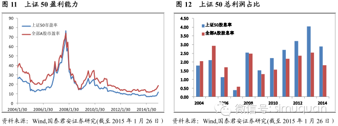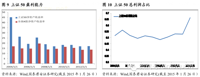 更好的理解上证 50 成份股特征,我们考察了上证 50 成份股在营运能力和估值水平的情况。上证 50 成份股在近年的 ROE 趋于稳定,处于 20%左右。同时,上证 50 净利润全市场占比在近年来一直相对稳定,只有在 2014 年,受券商股利润大幅增长影响,上证 50 的净利润占比有明显上升。