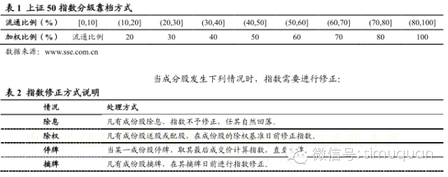 在权重的设置上,上证 50 指数采用派许加权的方式,按照样本股的调整股本数为权数进行加权计算。具体来说,在调整股本数上采用的是分级靠档的方式对成份股股本进行调整。具体的分级靠档方式如下表所示: