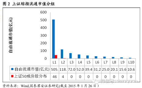 从市值分布的角度,图 1 展示了上证 A 股按股票数目平均分为 10 档后每档的平均总市值。可以看出,上证 A 股的市值分布集中度非常高,主要集中在前两档股票中(也就是前 200 只股票)。而绝大多数上证 50 的成份股(44 只)都集中在市值最大的一组。