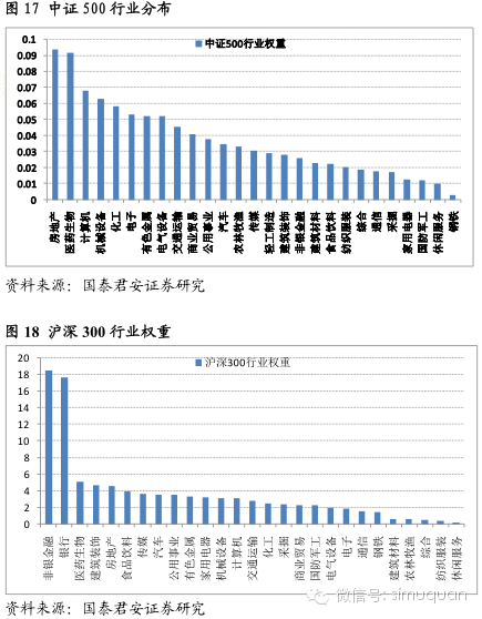 从行业分布角度来看,中证500 整体分布较为均匀,没有单一行业权重超过 10%的情况。其中权重较高的几个行业分别为房地产、医药生物、计算机,这与图 17 中以券商、金融等周期股为主的沪深 300 指数有很大的区别。此外,从量化策略角度来看,更分散的行业分布降低了策略在单一行业选股能力的要求,这使得中证 500 相较沪深 300 更适合作为对冲的标的指数。