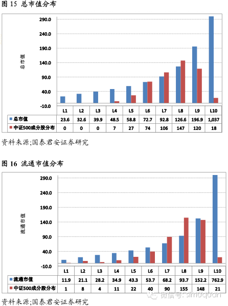 从图 15 我们可以看出,中证 500 相对沪深 300 的市值分布重心偏低,在全市场市值最高的 10%股票中仅有 18 只股票。但是,中证 500 并没有过度的偏向于小盘股、微型股,70%的成份股总市值都超过 100 亿。整体来说,中证 500 的成份股更接近于具备成长特征的中型股。在图 16中,我们从流通市值的角度观测中证 500 成份股的分布,其大致分布情况与之前保持一致。