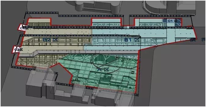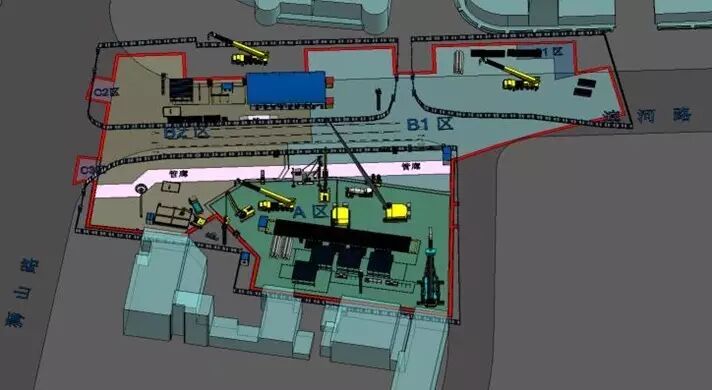 项目依托BIM技术进行项目整体分区建设BIM模拟,本工程根据施工区域整体工程划分为三个工区,分别为A区、B1区、B2区,附属工程划分为C1区、C2区、C3区,主体三个工区采取流水作业的方式进行施工。项目通过虚拟施工,对施组方案进行了优化和深化设计。
