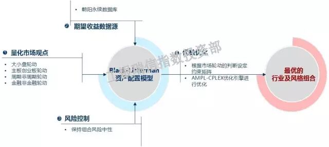 下图展示了本模型的基本框架。首先运用各类轮动模型进行多维度的市场风格判断,然后利用朝阳永续数据库的一致预期数据构建行业的预期收益率矩阵;接着,以Black-Litterman模型为框架,将组合的风险水平限定在1倍市场波动率以内,根据此前的风格判断结果确定具体的行业权重约束;最后运用Ampl-Cplex代数优化模型进行优化求解得到最优的行业组合。