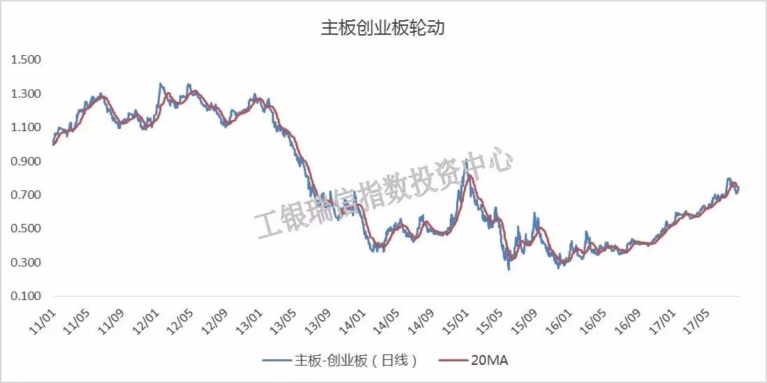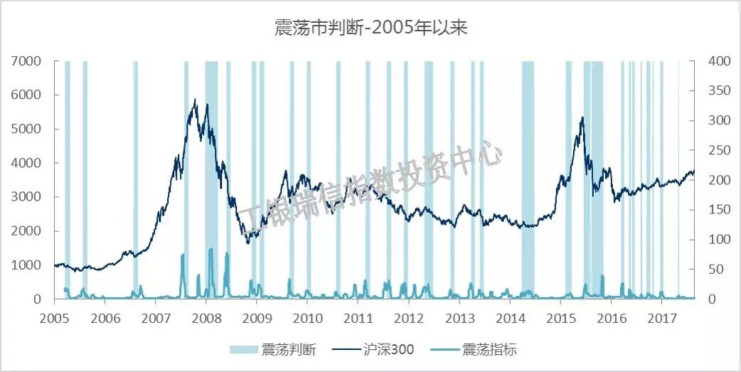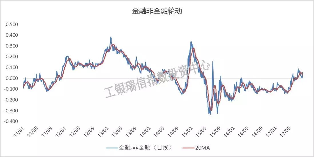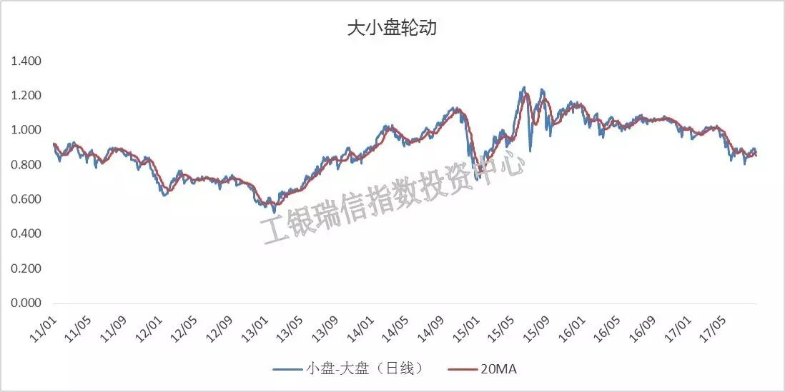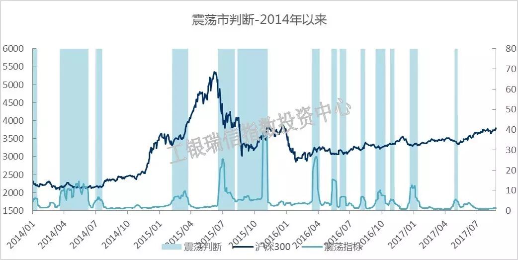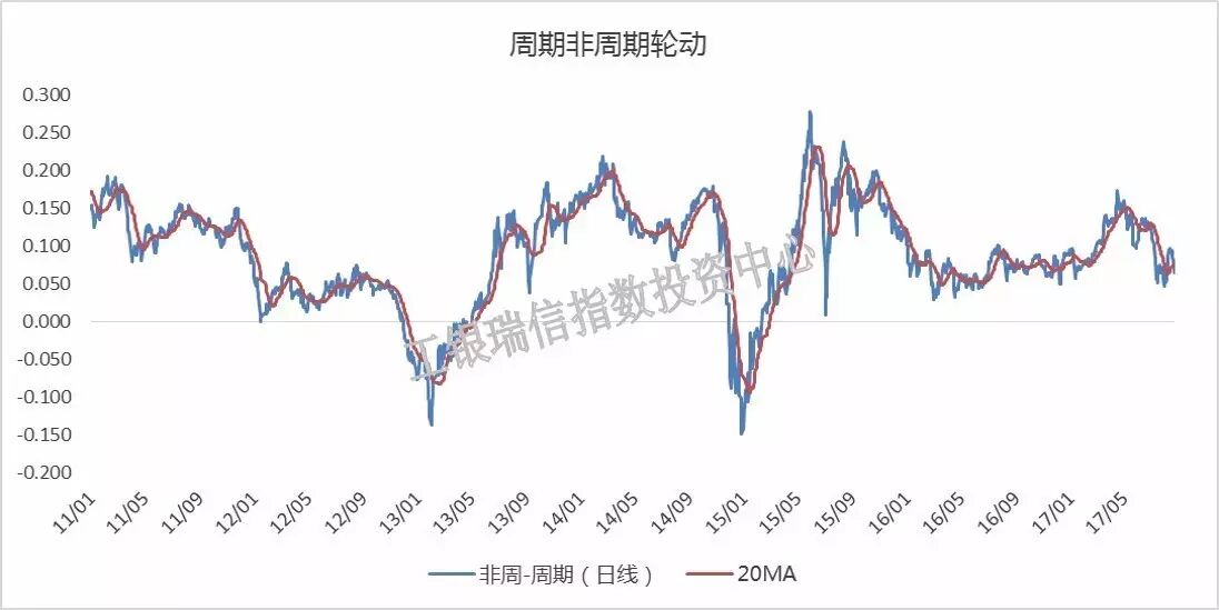 下面的一系列图给出了这些轮动指标的历史表现,其中震荡指标高于一定阈值表明市场为震荡市,否则为趋势市;其他指标则采用日线和均线的上下穿来进行轮动判断。从历史上看这些指标均表现出良好的稳定性,大部分情况下风格切换的判断能够维持一定时间,使得指标具备良好的实用性。