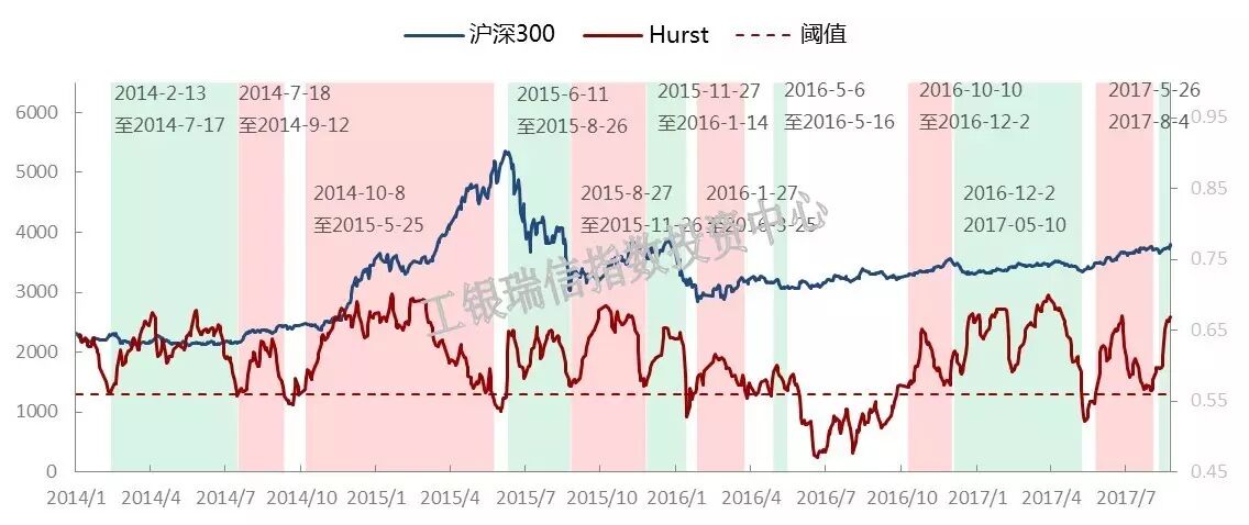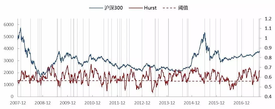 下图中,阈值虚线代表中国市场反转线,红线是Hurst指标时间序列。Hurst指标在阈值线上部代表市场处于趋势延续区,指标在阈值线下部代表市场处于趋势反转区,当红线上穿阈值线则代表一次明确的信号,指向市场前期趋势的一次反转。