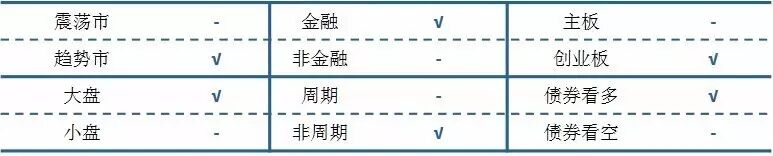 股市为趋势市;创业板相对主板占优,大盘相对小盘占优,金融相对非金融占优,非周期相对周期占优;债券看多。