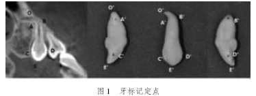 对重建后的图像进行调整,在冠状面和矢状面上旋转图像,使牙体长轴平行于这两个平面。调整后的CT图像包含以下定点:O为根尖点,A为牙根近中弯曲点(在正中冠状面上,牙根近中侧切线所形成交交角的角平分线与牙根近中弯曲处的交点),B为牙根远中弯曲点(在正中冠状面上,牙根远中侧切线所形成交交角的角平分线与牙根远中弯曲处的交点),C为近中切角点,D为远中切角点,E为牙尖点;釉牙骨质界(CEJ)是在冠状面上将垂直标志线移至牙体长轴,在矢状面上寻找釉质的最根方点。再以同法在离体牙上定点,标记点O'、A'、B'、C'、D'、E',如图1所示。分别测量线距OE、O'E'、CD、C'D'及唇舌向釉牙骨质界的距离和∠OAC、∠O'A'C'、∠OBE、∠O'B'E'、∠OBD及∠O'B'D'角度,如图2、图3。