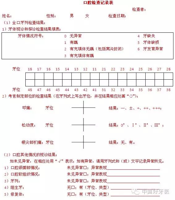 未在表格内列出的项目可以在检查表后的口腔其他情况的视诊结果中体现。如未见异常,在相应“□”出用个“√”表示;如有异常,请用牙列式和(或)位子记录异常所见,包括颌面部情况、软组织、牙列、阻生牙、修复体情况。