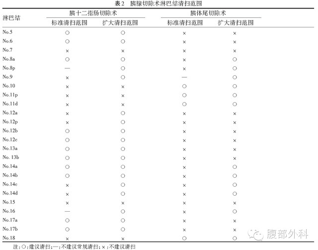 上述不同术式的胰腺切除标准及扩大的淋巴结清扫范围如表 2 所示。