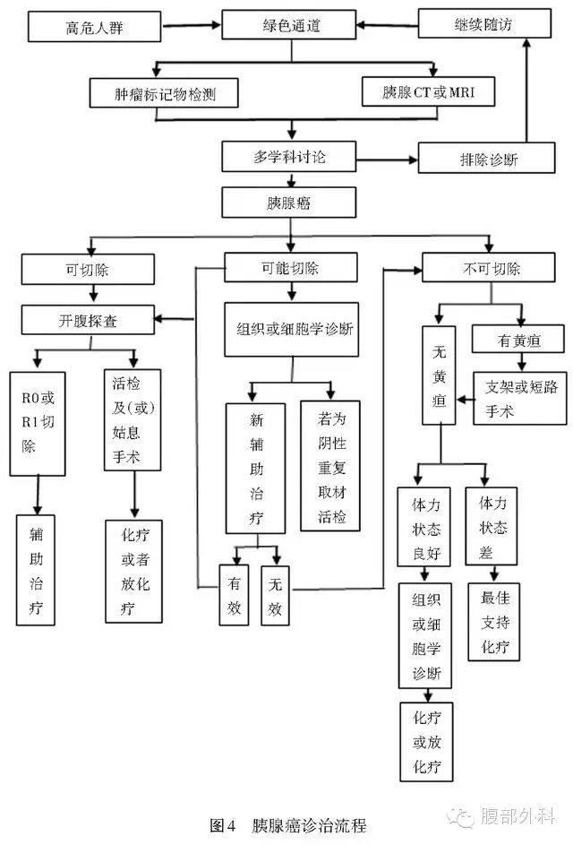 胰腺癌的诊治建议至较大规模的诊疗中心并在多学科综合治疗团队 (multidisciplinary team,MDT) 的模式下进行,包括外科.影像、内镜、病理、肿瘤内科、介入、放疗等专业人员的参与,并贯穿病人诊治的全部过程。根据病人的基础健康状况、临床症状、肿瘤分期及病理类型,共同制定治疗计划,个体化地应用多学科及多种治疗手段,以使病人达到最佳的治疗效果。