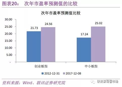 我们选择上周五和2012年底做一个纵向比较,由于2012年底是一个公认的成长股的估值底部,我们认为当前创业板指和中小板指的动态市盈率(次年)已经具备一定优势。比如创业板指底部估值是22X,而今是25X;中小板指底部估值是17X,而今是25X。
