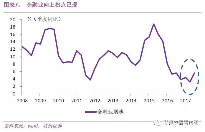 金融业中一些积极的因素正在增多,金融业的拐点已现。2017年三季度金融业产值同比增长5.6%,比二季度上升2.4个百分点,相当于多拉动了0.2个百分点的GDP,抵消了三季度房地产的下滑。
