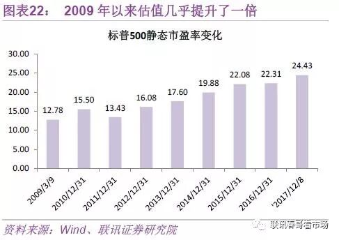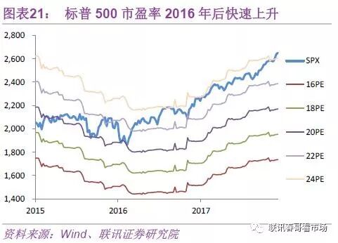这是美国股市历史上少有的高估值时期。2012-2015年的估值连续上升,2015-2016间的股票市场调整曾经让标普500市盈率回落到20X左右,调整之后2016年至今指数市盈率再次进入快速上升阶段。