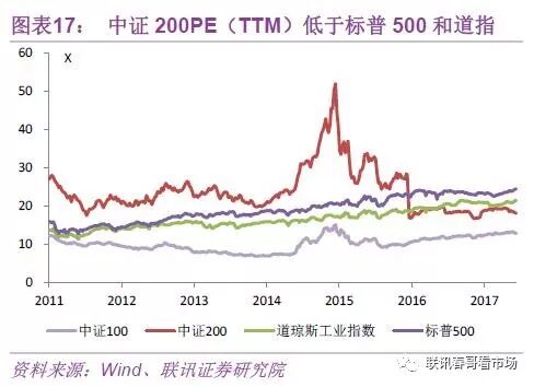 中证200指数的静态市盈率已经明显低于标普500指数和道琼斯工业指数。即便是中证500指数的静态市盈率经过今年以来的不断调整,已经非常接近纳斯达克100指数。