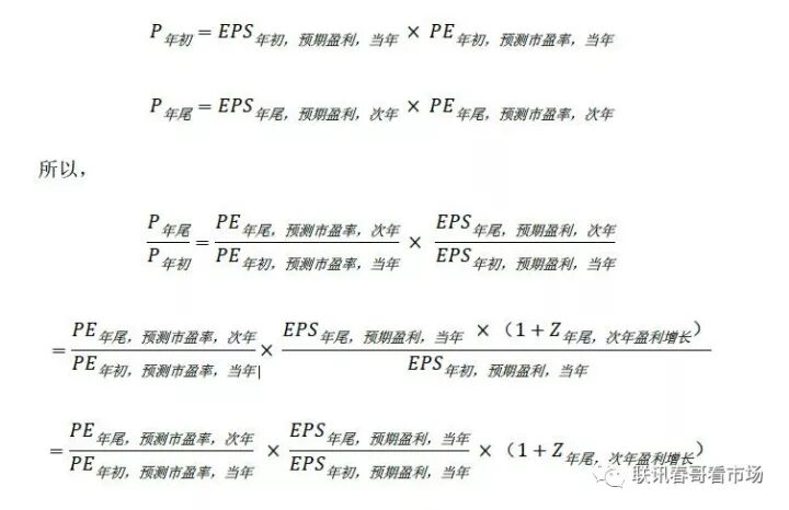 以上公式中,大家可以看到,一年股价的上涨由三个部分组成,一是动态估值的变化,二是年内对当年盈利的预期差,三是下一年的盈利增长预期。