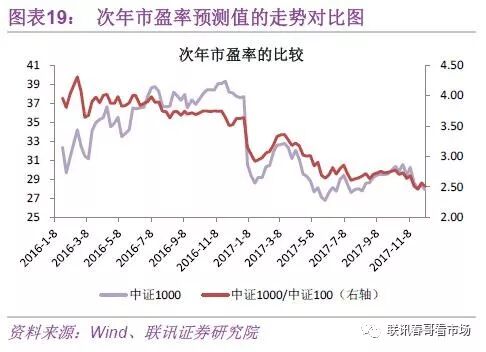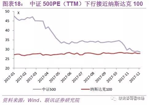 从A股内部结构看,中证100和中证1000的预测市盈率之间的鸿沟开始缩小。2016年初,两者之间的倍数在4X上下,目前已经下降到了2.5X左右。在2017年,中证1000的2018年预测市盈率一路下行,目前在28倍左右;而中证100的2018年预测市盈率当前在11倍左右。