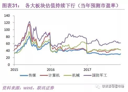 在持续的杀估值中,传媒、计算机等这类的中小市值股票估值水平已经大幅下降。传媒板块动态PE(当年)从2015年最高的80多倍下降到目前在30倍出头,计算机和机械板块也从2015年最高的110-120倍下降到目前的42-43倍;军工板块从2015年最高的120多倍下降到现在的62倍左右。