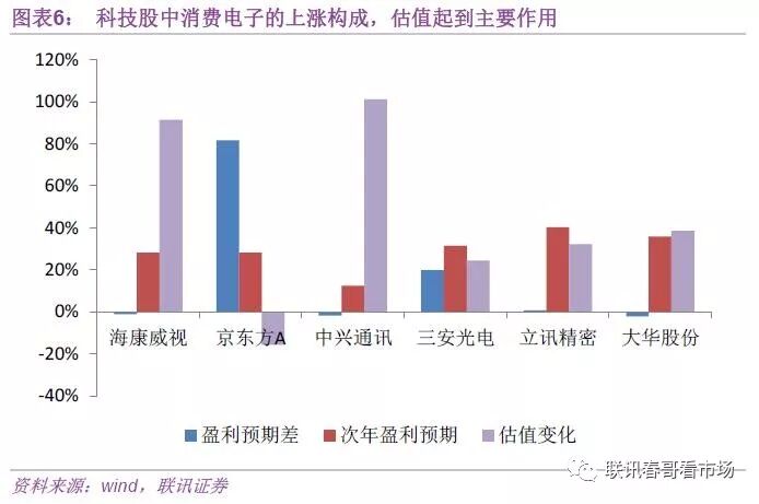 如果是科技股呢?首先是软硬分化非常严重,软的下跌,硬的上涨。其次以硬为标志的电子股,盈利的超预期情况并不统一,典型的安防电子股、通信设备商,盈利却是基本符合预期。在今年股价的巨幅上涨中,估值上行起到了决定性的作用。