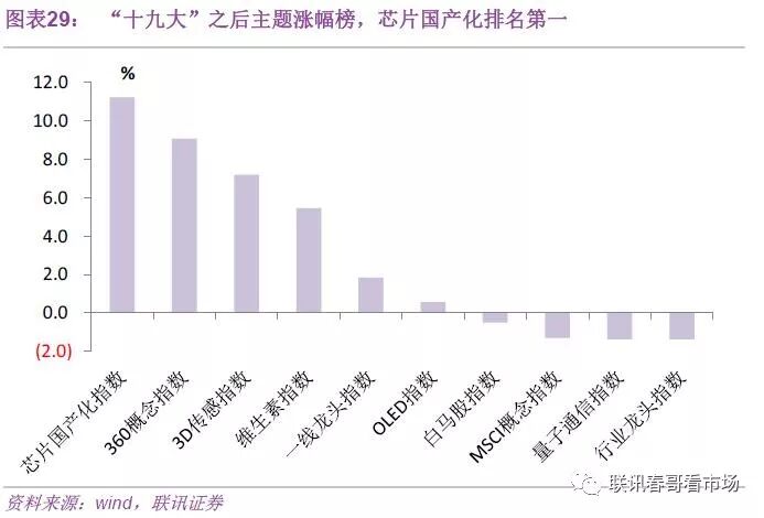 “十九大”会议前,会议相关主题投资并不热烈,但随着会议将先进制造、制造强国放在比较显眼的位置后,先进制造这个投资主题,成为“十九大”主题投资最大风口,最典型比如半导体、芯片。由于先进制造具有重资产、国家重器等鲜明色彩,核心资产这个概念得以发酵。