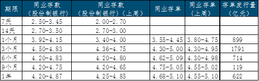 同业存款:本周同业存单发行量回升,升至近4200亿元,发行主要集中在3个月品种,其中股份制银行 1个月存单价格仍维持在4.00,3个月存单价格上行至4.70,6个月存单价格上行至4.70。同业存款方面,1个月及3个月存款价格有所上行。